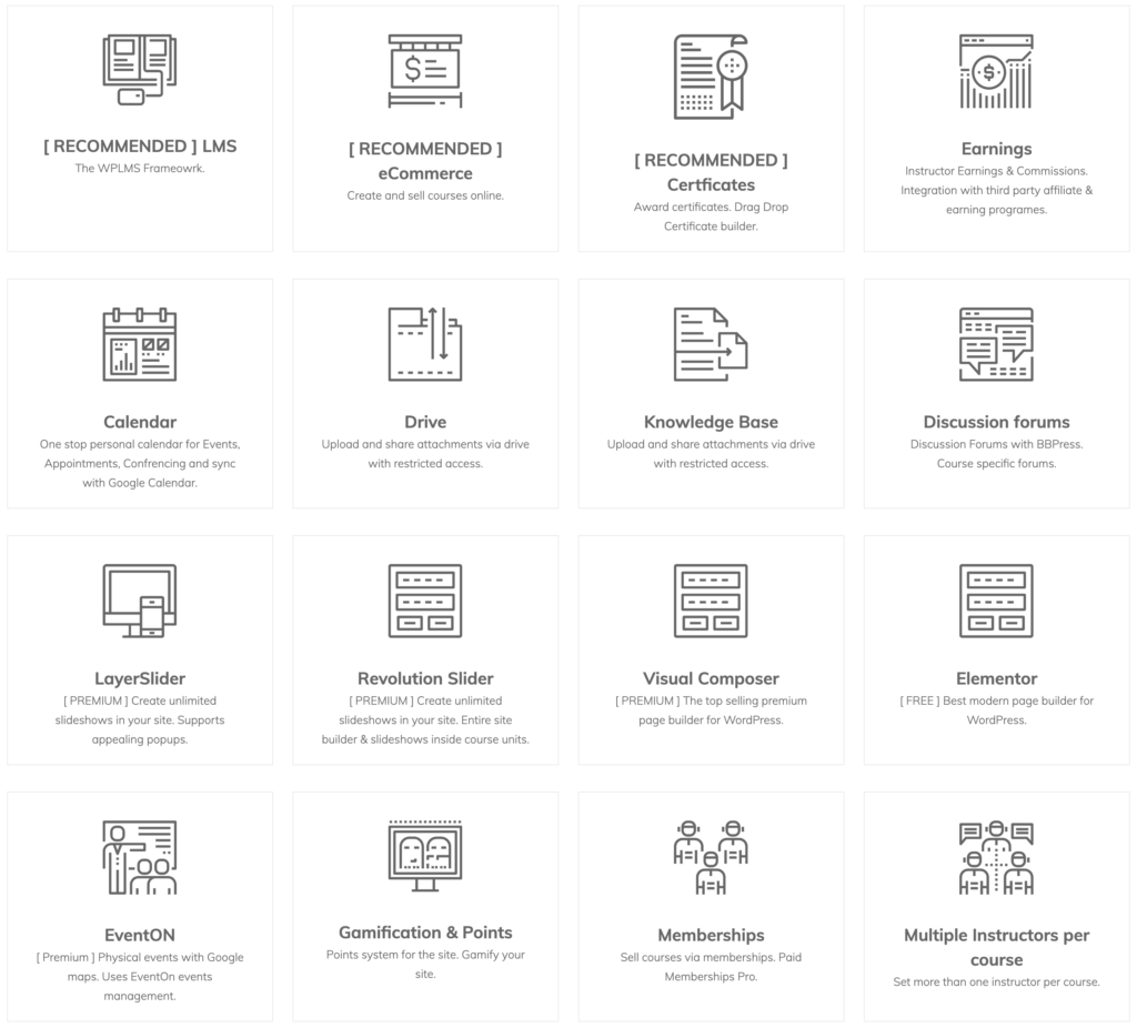 All Wplms modules in the App. Conferencing, Calendars.